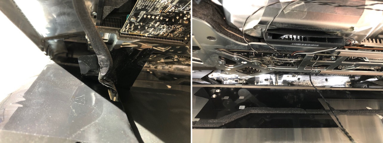 메인보드 분리 후 뒤집으면 CPU 쿨러 (좌)와 그래픽카드 및 GPU 쿨러 (우) 가 보입니다. 각각 케이블이 보드에 연결되어 있으니 위치 확인 후 분리해 주세요.